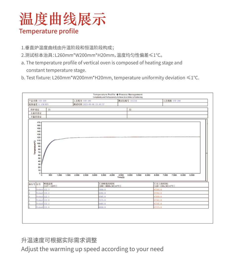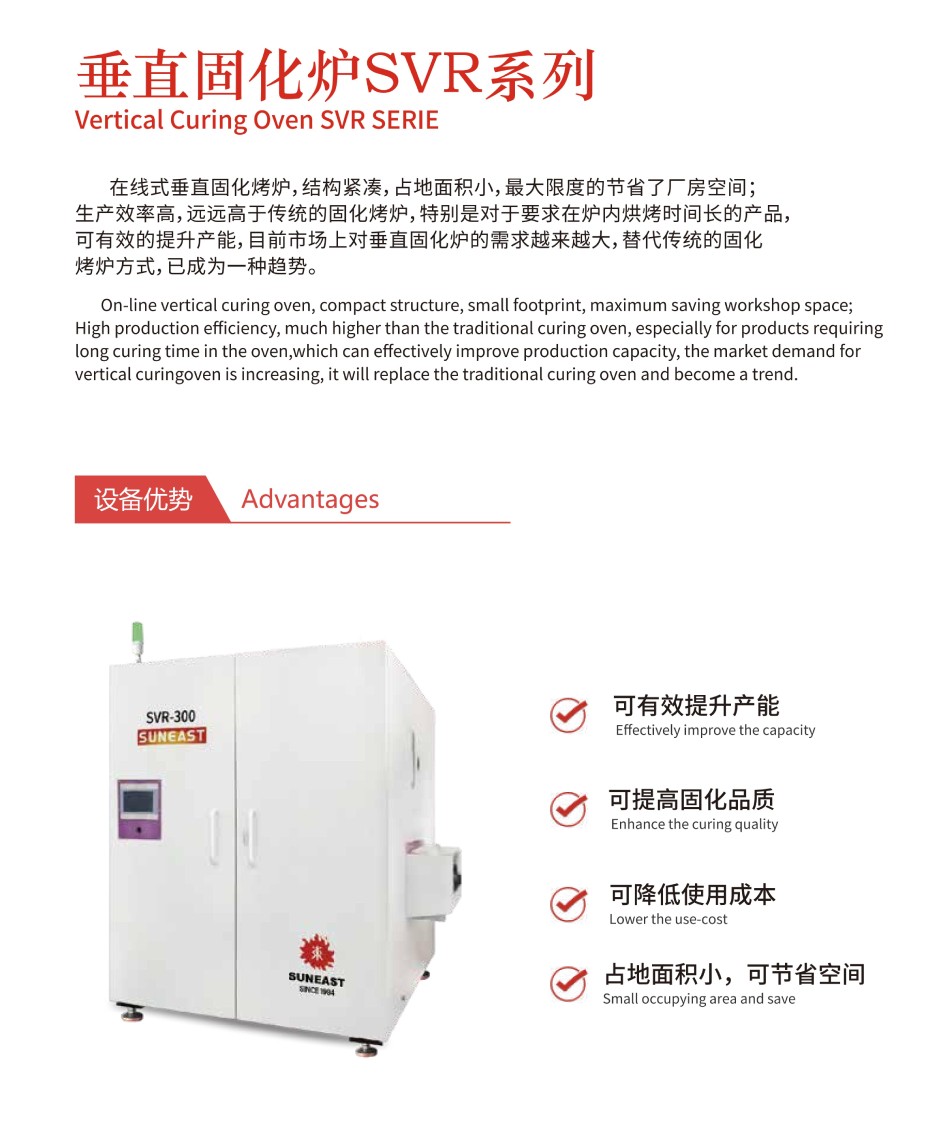 在線式垂直回流烤爐,結構緊湊,占地面積小,最大限度的節(jié)省了廠房空間;生產(chǎn)效率高,遠遠高于傳統(tǒng)的固化烤爐,特別是對于要求在爐內(nèi)烘烤時間長的產(chǎn)品,可有效的提升產(chǎn)能。