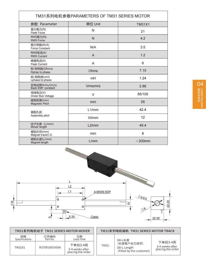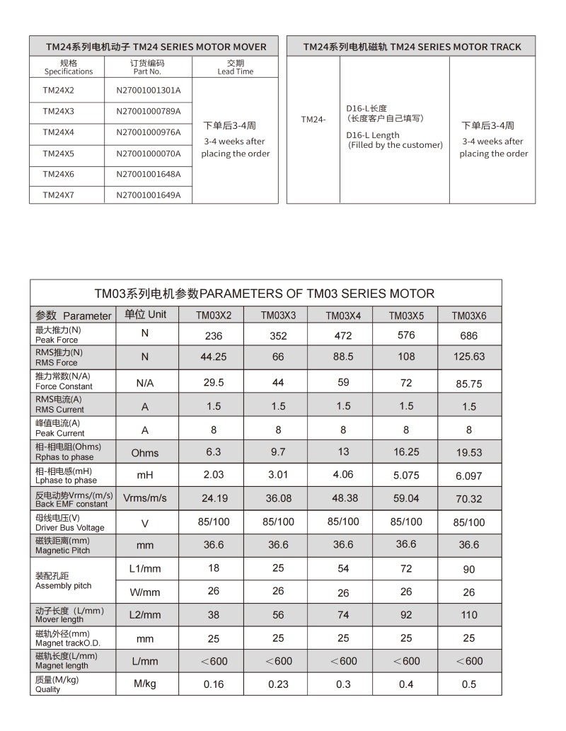 | TM 24系列圓柱形直線電機參數(shù)PARAMETERS OF TM 24 SERIES MOTOR | |||||||