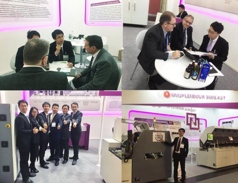 2017年11月14日至17日,Productronica2017在德國(guó)慕尼黑新國(guó)際博覽中心舉行。日東科技攜選擇性波峰焊SUNFLOW3、無(wú)鉛回流焊SER706A、全自動(dòng)錫膏印刷機(jī)SL120亮相Productronica2017展。