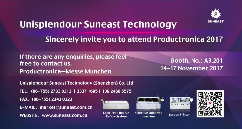 2017年11月14日至17日,Productronica2017將在德國(guó)慕尼黑新國(guó)際博覽中心舉行。屆時(shí),日東科技將攜帶選擇性波峰焊SUNFLOW3、回流焊SER706A、全自動(dòng)錫膏印刷機(jī)SL120亮相Productronica2017展會(huì),歡迎大家蒞臨A3.201展臺(tái)參觀。