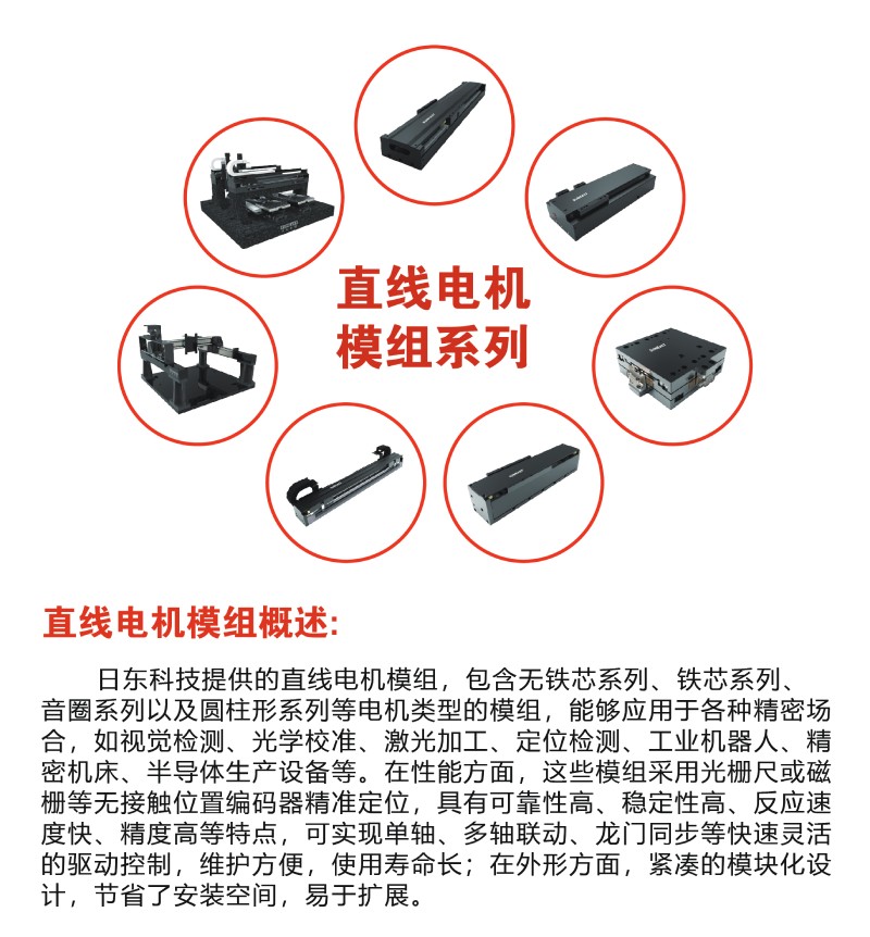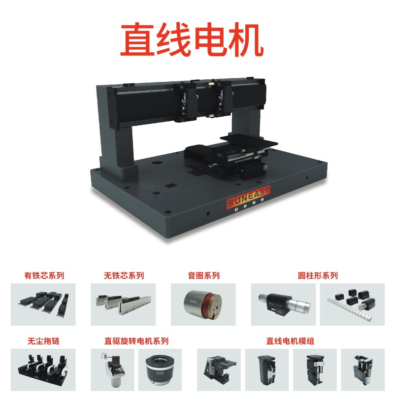 日東科技自主研發(fā)的直線電機(jī)產(chǎn)品系列,集高精度(100納米重復(fù)定位精度)、高響應(yīng)速度、高穩(wěn)定性及可靠性等優(yōu)點(diǎn),廣泛應(yīng)用于各行業(yè)精密場合,如視覺檢測、光學(xué)校準(zhǔn)對位、激光加工、工業(yè)機(jī)器人、精密機(jī)床等。產(chǎn)品采用光柵尺或磁柵等無接觸位置編碼器精準(zhǔn)定位,可實(shí)現(xiàn)單軸、多軸聯(lián)動,龍門同步等快速靈活的驅(qū)動控制,維護(hù)方便,使用壽命長,同時緊湊的模塊化設(shè)計節(jié)省了安裝空間,易于擴(kuò)展。