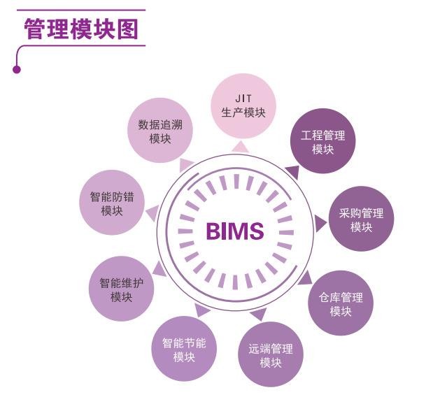 BIMS系統(tǒng)以模塊化的方式提供了一系列獨特的管理工具及方法,可重構(gòu)生產(chǎn)管理系統(tǒng)或制造執(zhí)行系統(tǒng)。自主研發(fā)的快速重構(gòu)機(jī)制,可根據(jù)客戶業(yè)務(wù)需求,系統(tǒng)各模塊可靈活組裝并深度定制。可快速添加新功能,使BIMS系統(tǒng)更好的延展。從基本功能架構(gòu)上看,BIMS系統(tǒng)的主要功能包括:JIT生產(chǎn)、數(shù)據(jù)追溯。智能防錯、智能維護(hù)、智能節(jié)能、遠(yuǎn)端管理、倉庫管理、采購管理和工程管理。實際的客戶系統(tǒng)詳細(xì)功能因需定制,與標(biāo)準(zhǔn)的功能架構(gòu)有所偏差。