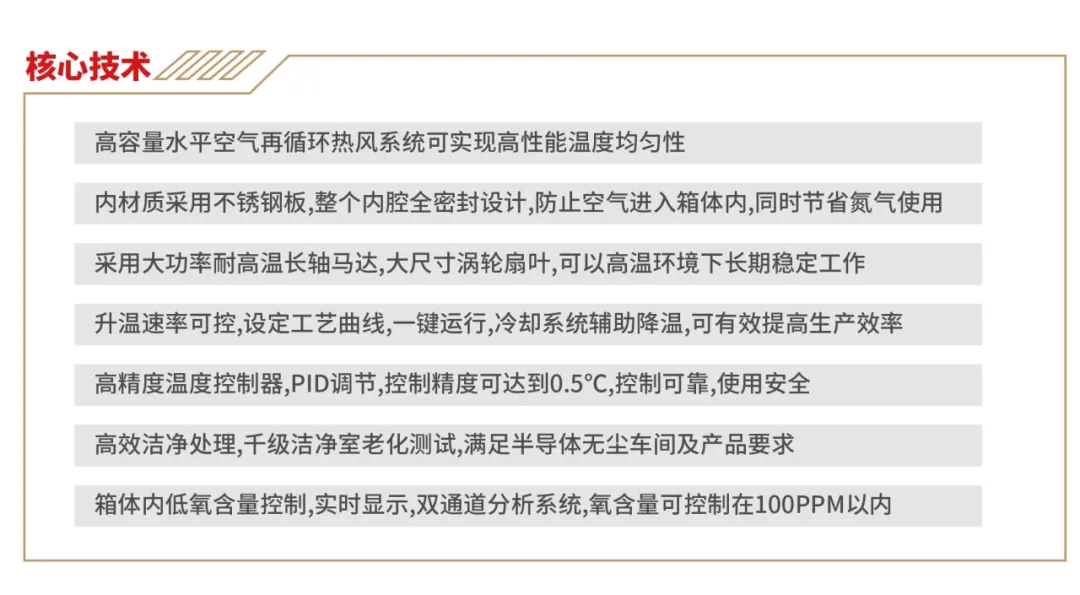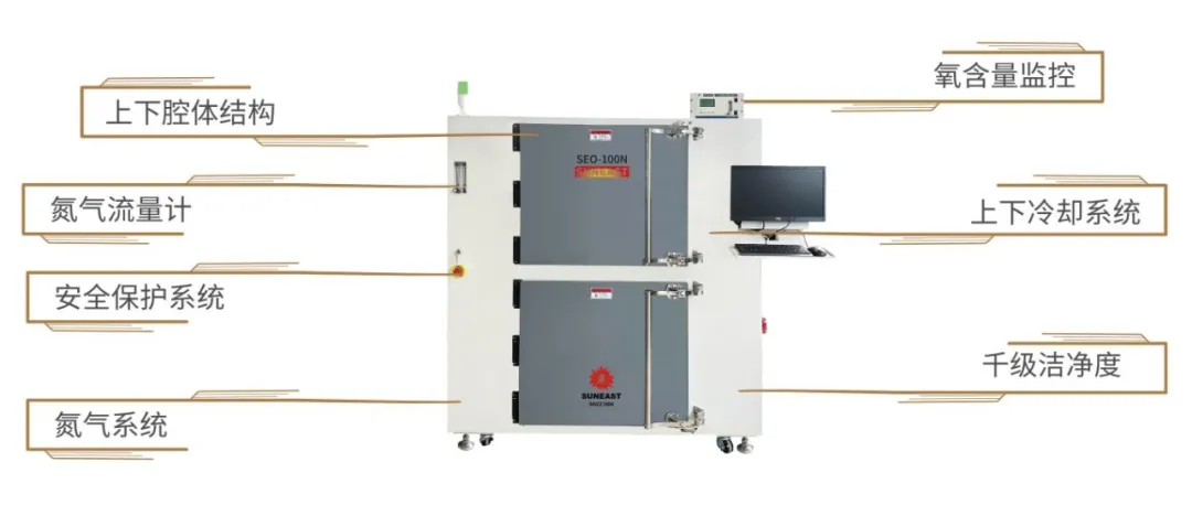 日東科技SEO系列半導體充氮烤箱通用性強,通過充入氮氣將烤箱中的氧氣排出,防止烘烤高溫產(chǎn)生氧化現(xiàn)象。設備采用高容量水平空氣再循環(huán)系統(tǒng),采用專有的腔室結(jié)構(gòu)和密封技術(shù),具有出色的氣密性和溫度均勻性,滿足半導體產(chǎn)品高性能要求,適用于固化半導體晶圓、IC封裝(銅基板,銀膠,硅膠,環(huán)氧樹脂)、玻璃基板等產(chǎn)品烘烤。