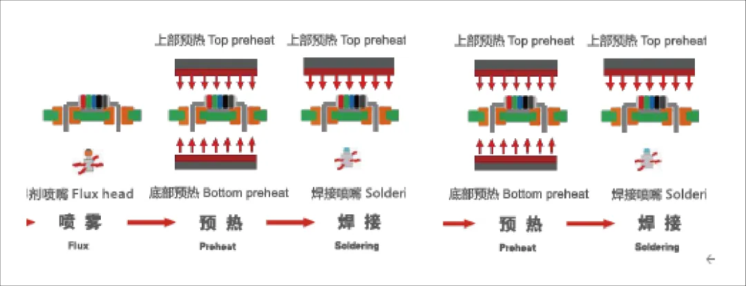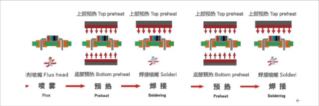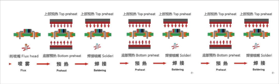 ③ 噴霧+預熱+焊接+預熱+焊接+預熱+焊接