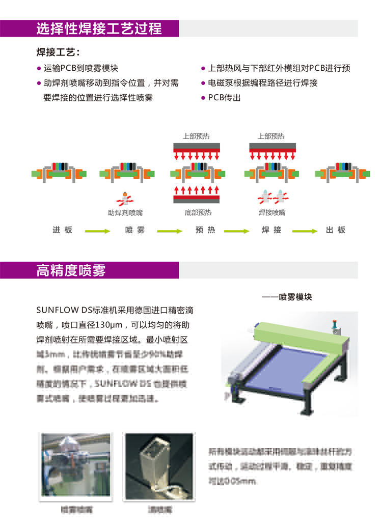 2.精確設置過的助焊劑噴涂,只施用于焊盤和插腳上,可以確保PCB板的高潔凈度,無須另外清潔。