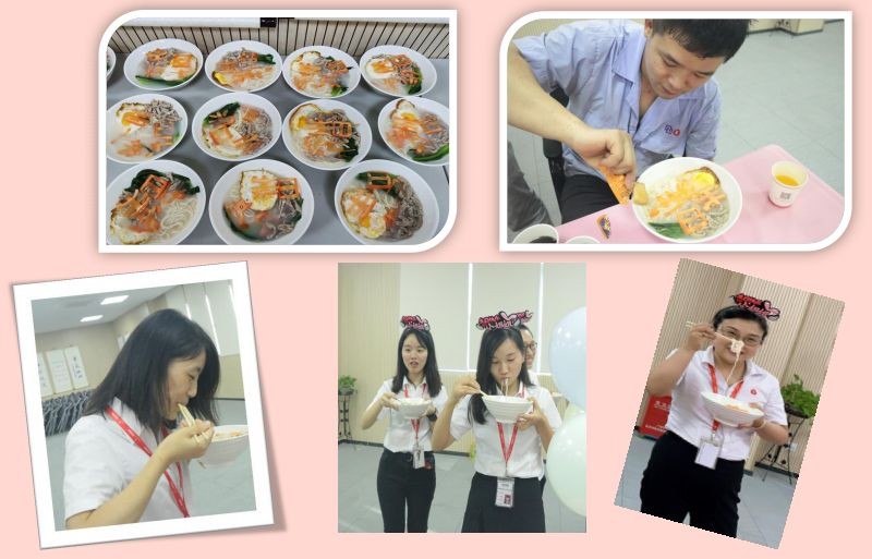 糖心荷包蛋、肉絲、胡蘿卜雕刻的“生日快樂(lè)“,組成這一碗代表公司對(duì)壽星們美好祝福的長(zhǎng)壽面,一口下肚有沒(méi)有小時(shí)候的感覺(jué)!