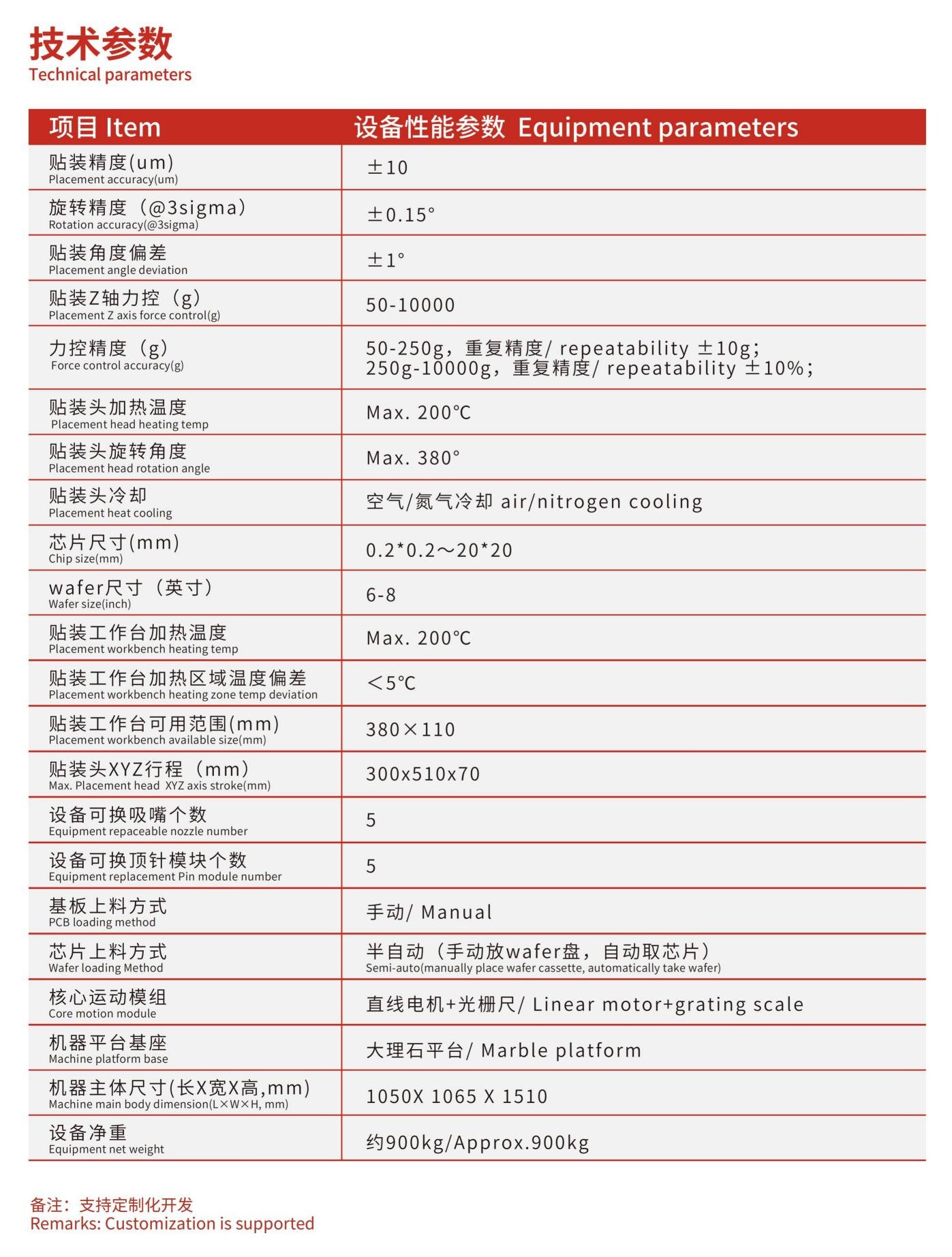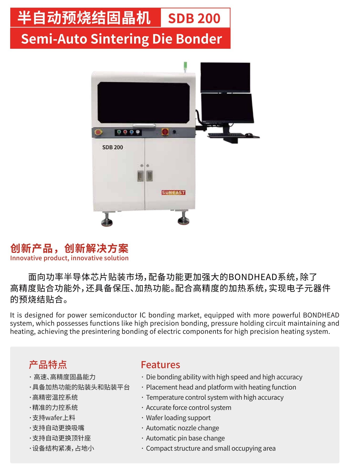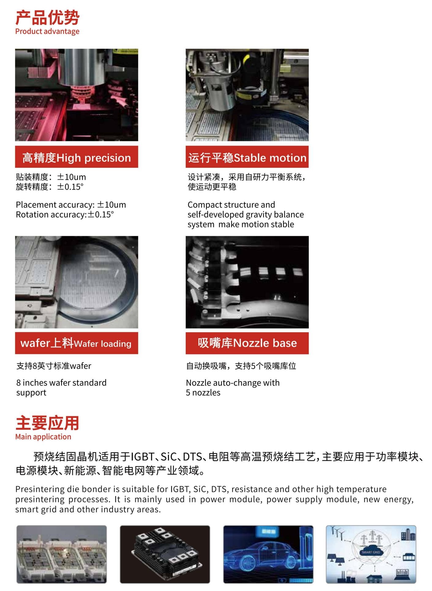 預燒結貼合機面向功率半導體芯片貼裝市場,配備功能更加強大的BONDHEAD系統(tǒng),除了高精度貼合功能外,還具備保壓、加熱功能。配合高精度的加熱系統(tǒng),實現電子元器件的預燒結貼合。