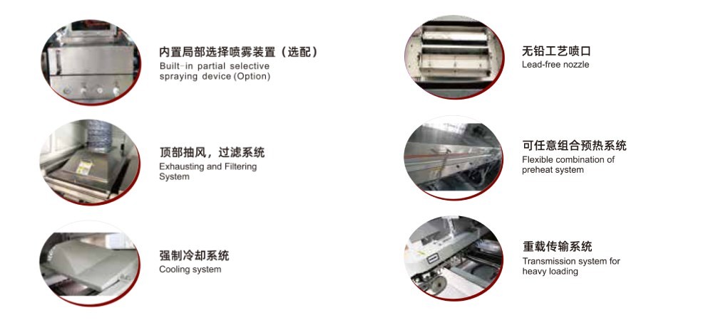 預熱系統(tǒng):優(yōu)化微熱風循環(huán)路徑,溫區(qū)內(nèi)溫度更均勻穩(wěn)定;噴霧抽風系統(tǒng):采用全新理念,分體式設計,維護保養(yǎng),方便快捷;內(nèi)置局部選擇噴霧裝置(選配):是步進電機通過同步帶及滾珠絲桿,直線導軌等作X和Y方向的運動來實現(xiàn)局部選擇噴涂助焊劑。