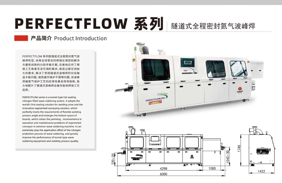 PERFECTFLOW 系列隧道式全程密封氮氣波峰焊,采用全球首創(chuàng)的焊接區(qū)域密封解決方案和創(chuàng)新的分段傳輸方案,完美地應對了焊接工藝角度靈活可調(diào)的需求,板底過板空間加大的需求,解決了常規(guī)隧道式波峰焊的分段輸送卡板問題,使用操作維護不便等問題,將波峰焊接氮氣保護工藝的應用效果發(fā)揮到極致,極大地提升了隧道式波峰焊設(shè)備性能和焊接工藝品質(zhì)。
