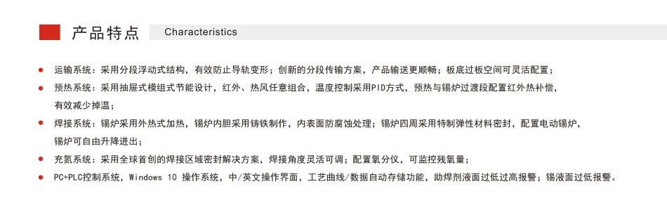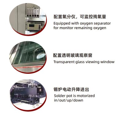 PC+PLC控制系統(tǒng):Windows10操作系統(tǒng),中/英文操作界面,工藝曲線/數(shù)據(jù)自動存儲功能,助焊劑液面過低過高報警;錫液面過低報警。